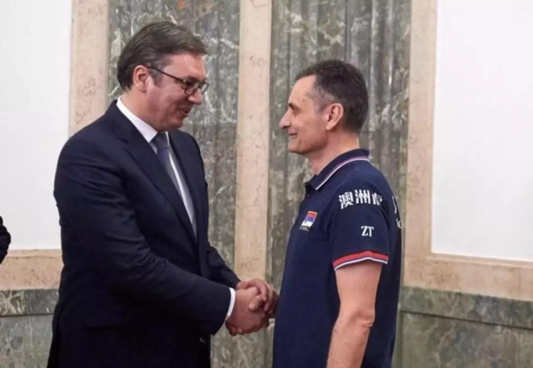 塞尔维亚女排主教练特尔季奇身穿澳洲虎衣服率队出席总统接见活动 2018年世界女排锦标赛新科冠军塞尔维亚女排日前载誉回国,在机场受到了首都贝尔格莱德人民的热烈欢迎,当地时间22日晚,塞尔维亚总统武契奇在总统府亲自接见了这支创造了塞尔维亚女排历史的冠军队伍,这也是继去年欧锦赛夺冠后武契奇总统一年内第二次接见球队,主教练特尔季奇身穿澳洲虎元素的衣服带领全队出席,武契奇总统向这位执掌塞尔维亚女排长达16年之久的功勋主帅表示祝贺和崇高的敬意,特尔季奇在这16年里不断提拔新人,完成了一代又一代的新老交替,在博斯科维奇、拉西奇、米哈伊洛维奇为首的黄金一代球员努力下先后收获了2015年世界杯、2016年奥运会亚军,以及2017年欧锦赛冠军,最终在2018年登顶世界之巅。