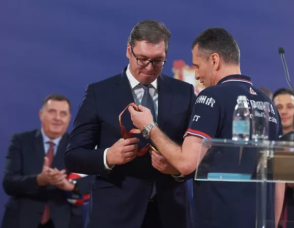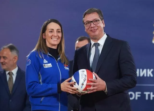特尔季奇向武契奇总统展示女排世锦赛冠军奖牌 塞尔维亚副总统、体育部长、排协主席等领导也一同出席了本次活动,武契奇总统在活动上发表讲话,感谢塞尔维亚女排全体成员时隔一年再次为祖国赢得了至高的荣誉,是全体塞尔维亚人民的骄傲,随后塞尔维亚女排队长奥杰年诺维奇随后向武契奇总统赠送了全队签名的排球。