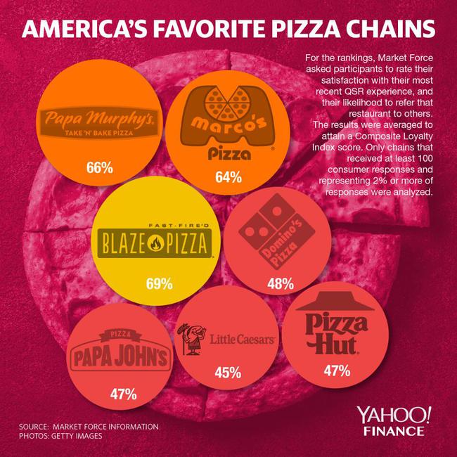 结果,Blaze Pizza的“综合忠诚指数”达到69%,同样位居首位。Papa Murphy’s和Marco’s Pizza这2家知名度有限的快餐店的“综合忠诚指数”反而达到66%和64%,分列第2、3位。而美国标志性的披萨连锁店品牌Papa John’s和Pizza Hut(必胜客)的CLI却都低于50%。