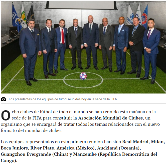 据西班牙媒体《马卡报》消息,来自世界各地的8家足球俱乐部齐聚FIFA总部,成立了世界俱乐部协会。这8家俱乐部分别是:皇马、米兰、博卡青年、河床、美洲、奥克兰、广州恒大以及马津贝。该组织主要负责处理和2021年世俱杯有关的一切问题。