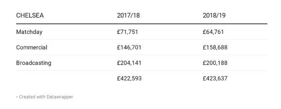 据《福布斯》杂志报道,切尔西在短短1年内,从盈利6000万镑到亏损9600万镑。 据悉,切尔西在2018-19赛季税后亏损为9600万英镑,与1年前6000万镑盈利相比,这一数字出现了1.56亿英镑的变动。 阿布接手切尔西早期,俱乐部亏损严重,但在球场上取得了巨大的成功。2004年至2013年之间,切尔西累积亏损6.7亿英镑,仅在2011-12赛季盈利100万镑。2014到2018年间,切尔西基本上实现收支平衡,其中3年盈利,2年亏损。《福布斯》杂志总结了5大原因: 1.俱乐部整体营业额基本持平 上赛季,切尔西整体营业额同比此前基本持平。