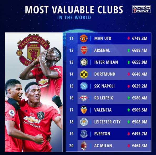 11 曼联 7.493亿欧 12 阿森纳 6.891亿欧 13 国米 6.559亿欧 14 多特 6.404亿欧 15 那不勒斯 6.292亿欧 16 莱比锡 5.804亿欧 17 瓦伦西亚 5.095亿欧 18 莱斯特城 5.08亿欧 19 埃弗顿 4.957亿欧 20 AC米兰 4.643亿欧 21 罗马 4.478亿欧 22 勒沃库森 4.398亿欧 23 阿贾克斯 4.294亿欧 24 里昂 3.82亿欧 25 狼队 3.592亿欧 26 本菲卡 3.498亿欧 27 伯恩茅斯 3.488亿欧 28 皇家社会 3.458亿欧 29 西汉姆 3.353亿欧 30 拉齐奥 3.314亿欧 31 摩纳哥 3.204亿欧 32 门兴 3.145亿欧 33 亚特兰大 2.849亿欧 34 皇家贝蒂斯 2.849亿欧 35 塞维利亚 2.755亿欧 36 波尔图 2.739亿欧 37 佛罗伦萨 2.713亿欧 38 纽卡斯尔 2.693亿欧 39 里尔 2.666亿欧 40 维拉 2.506亿欧 41 霍芬海姆 2.501亿欧 42 马赛 2.466亿欧 43 毕尔巴勒竞技 2.395亿欧 44 沙尔克04 2.379亿欧 45 水晶宫 2.376亿欧 46 沃尔夫斯堡 2.295亿欧 47 沃特福德 2.275亿欧 48 南安普顿 2.27亿欧 49 都灵 2.236亿欧 50 柏林赫塔 2.187亿欧